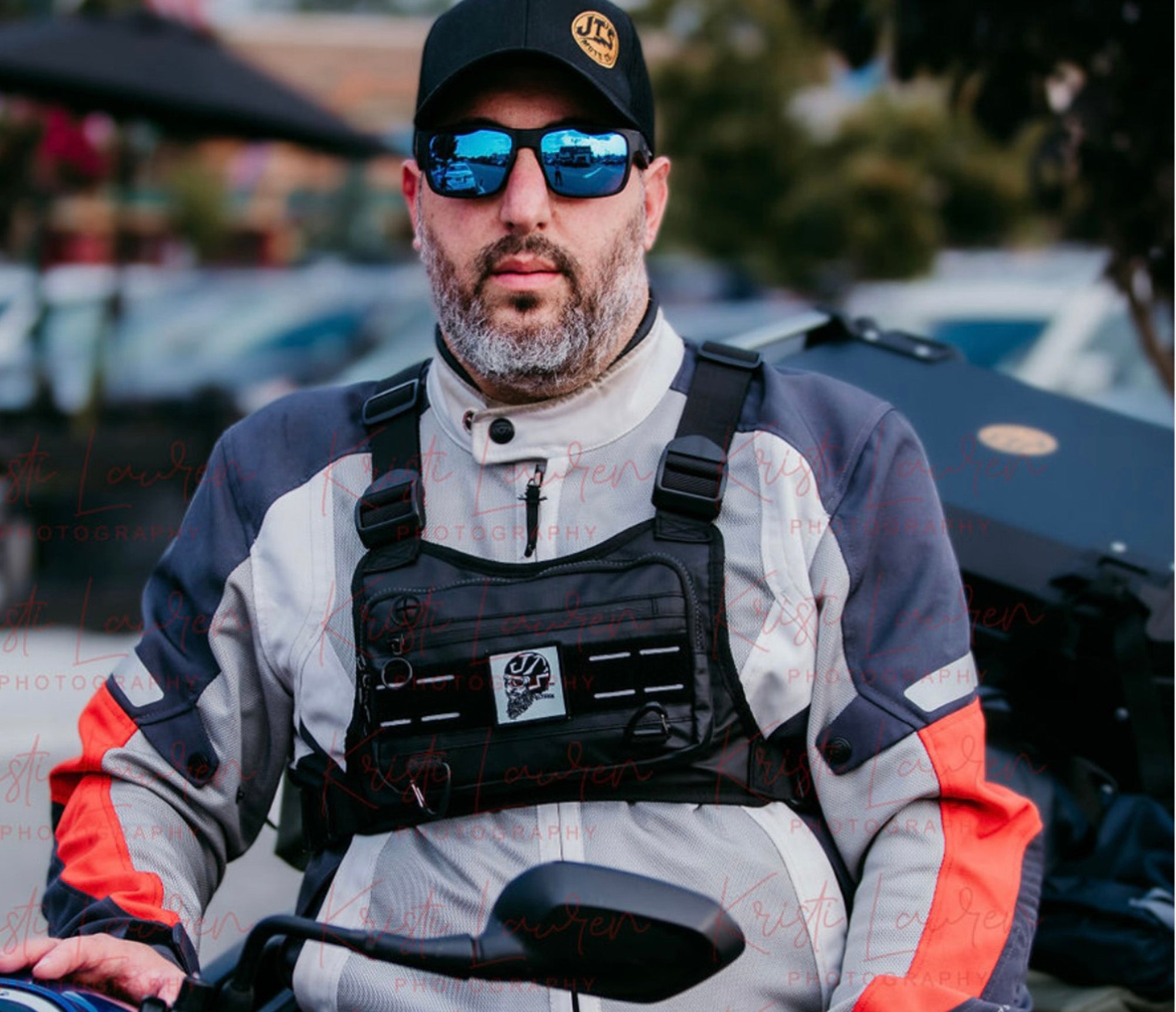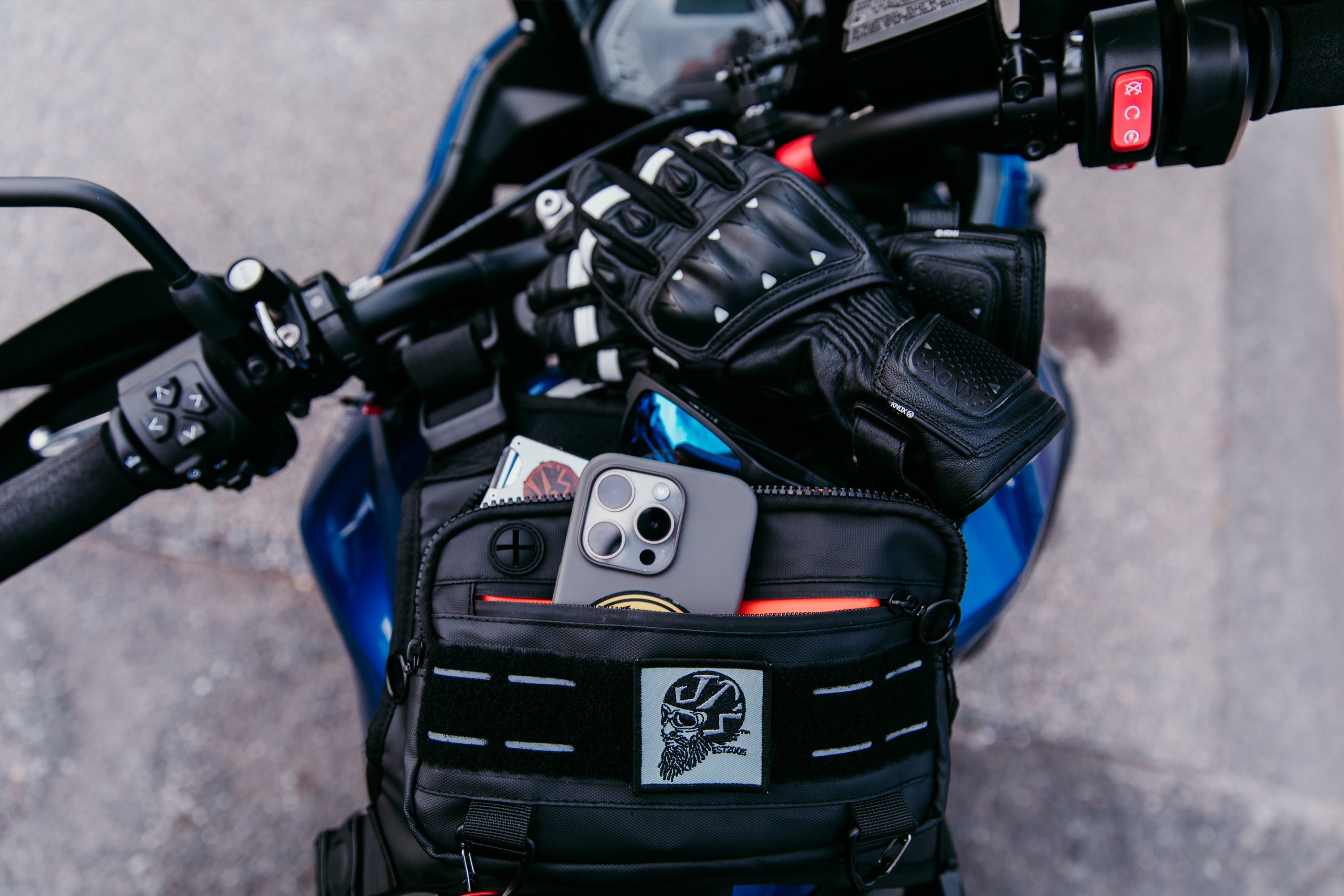 We've all been there -- you’re out for a ride and you stop for gas, coffee, or to enjoy the view. You need to pay or take a picture and off come the gloves. Then it’s feeling around to figure out which pocket your wallet and phone are in. Probably two different ones. By the time you pay, or take that picture, your helmet, jacket, and gloves are thrown over your bike. They all have to go back on before you get back on the road. Wasted time on a perfect riding day. Well, not anymore. The JT's Moto Pack offers you the ease of your essentials at your fingertips. Sitting virtually weightless on your chest, this water resistant nylon pack carries everything you want to carry safely and securely. Phone, wallet, keys, and more! With large metal zipper loops, your gloves don’t even have to leave your hands to get what you need. Whether you're running errands or on the road trip you've been dreaming about, this is one accessory that will enhance every ride!